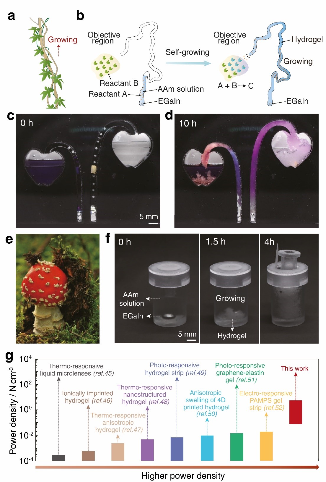 水凝胶的自生长行为成功模拟自然爬藤现象(图2 a-d),在软壁攀爬机器人中显示出巨大的前景,在小型弯曲管道方面具有明显的优势。此外,受自然植物“破土而出”启发,研究团队将自生长“动力”转化为“驱动力”,设计了自生长水凝胶致动器(图2 e-f),成功将一特定容器打开。与大部分水凝胶致动器需要光/热/电等外界能量触发不同,自生长水凝胶致动器不需要输入任何额外能量,且功率密度显著高于其他水凝胶致动器,体现出自发、高效、可控的致动功能。